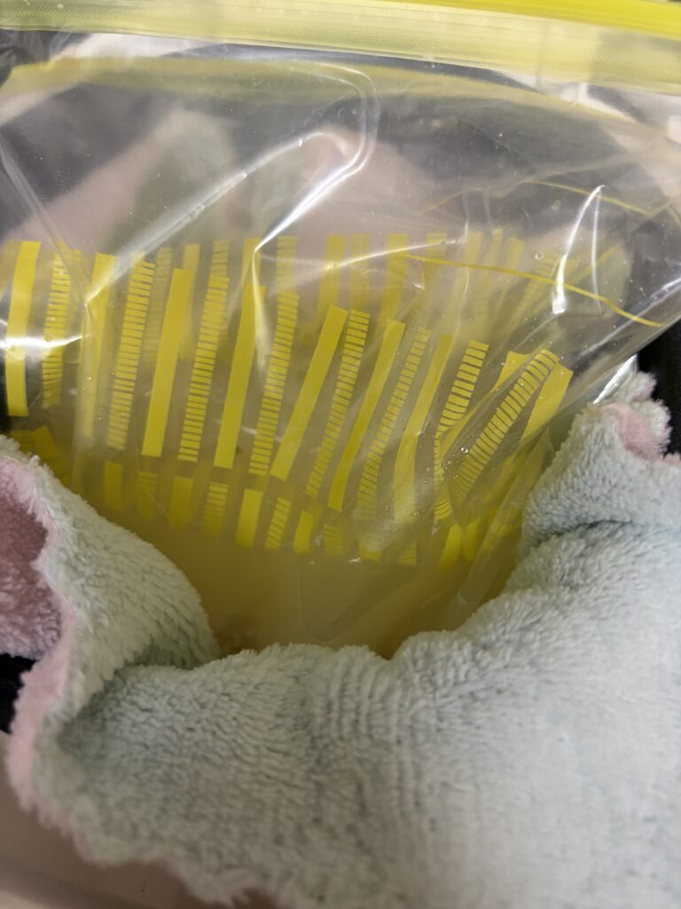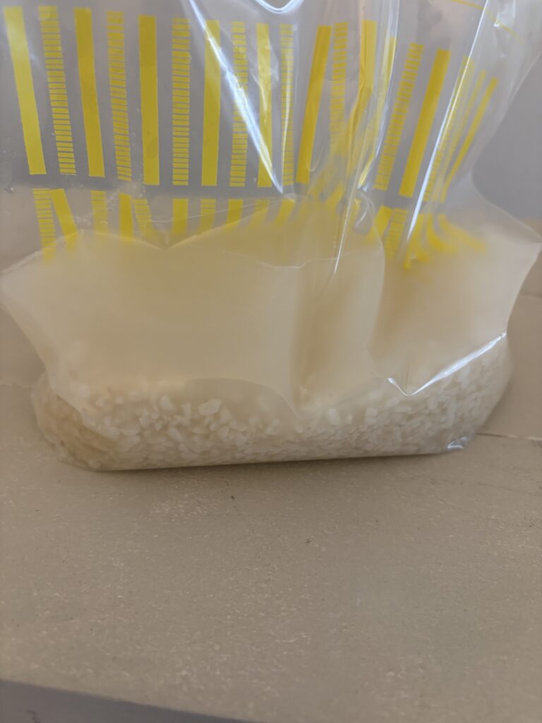 2 ジッパー付き保存袋に米麹を入れ、お湯を加えます